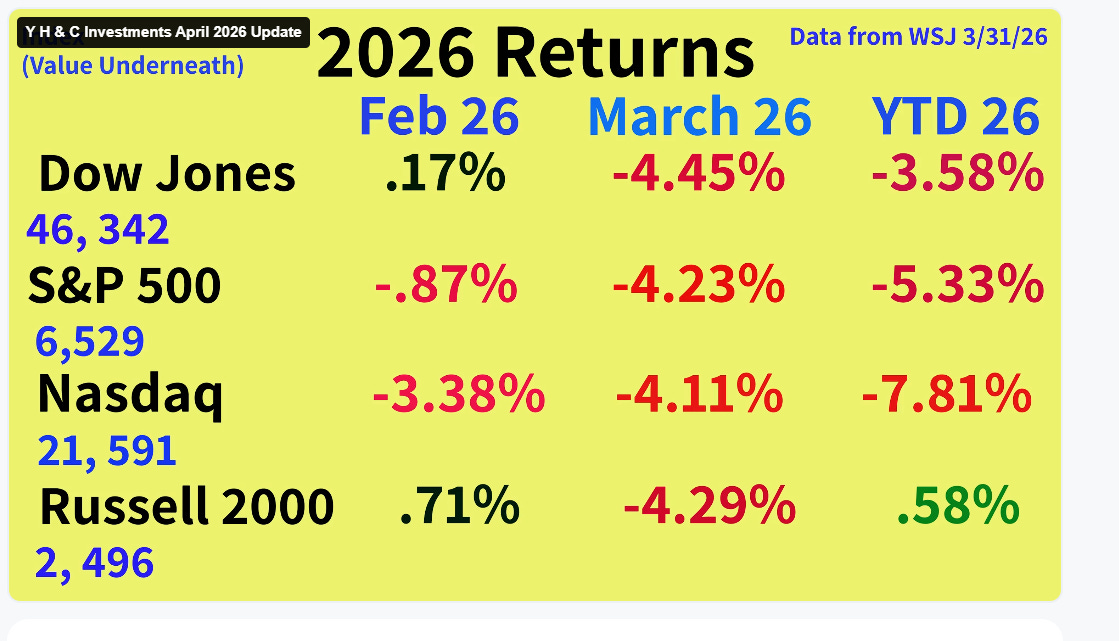 (Return figures come from the March 31, 2026, edition of the Wall St. Journal. Y H & C Investments may have positions in companies mentioned in this newsletter. Nothing in the newsletter should be taken as an offer to buy or sell individual securities. It is the responsibility of each investor to research the investments mentioned so they can decide on the appropriateness and suitability of the investments consistent with their risk tolerance, risk constraints, and return objectives.)