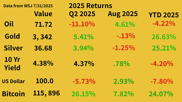 (Return figures come from the July 31, 2025, edition of the Wall St. Journal. Y H & C Investments may have positions in companies mentioned in this newsletter. Nothing in the newsletter should be taken as an offer to buy or sell individual securities. It is the responsibility of each investor to research the investments mentioned so they can decide on the appropriateness and suitability of the investments consistent with their risk tolerance, risk constraints, and return objectives)