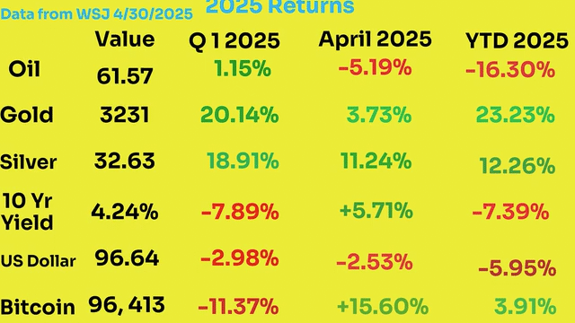 (Return figures come from the April 30, 2025, edition of the Wall St. Journal. Y H & C Investments may have positions in companies mentioned in this newsletter. Nothing in the newsletter should be taken as an offer to buy or sell individual securities. It is the responsibility of each investor to research the investments mentioned so they can decide on the appropriateness and suitability of the investments consistent with their risk tolerance, risk constraints, and return objectives)