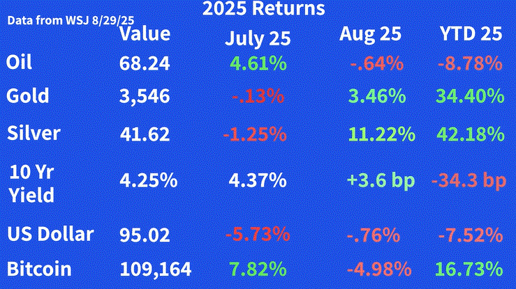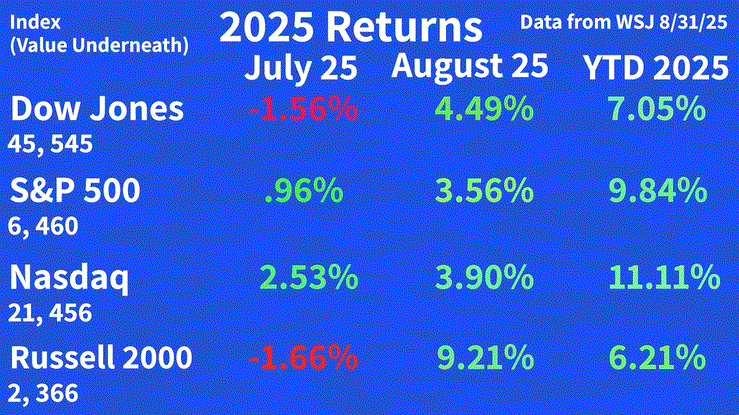 (Return figures come from the August 29, 2025, edition of the Wall St. Journal. Y H & C Investments may have positions in companies mentioned in this newsletter. Nothing in the newsletter should be taken as an offer to buy or sell individual securities. It is the responsibility of each investor to research the investments mentioned so they can decide on the appropriateness and suitability of the investments consistent with their risk tolerance, risk constraints, and return objectives)